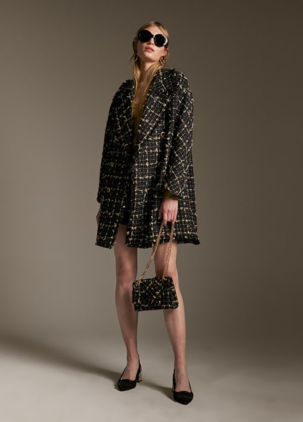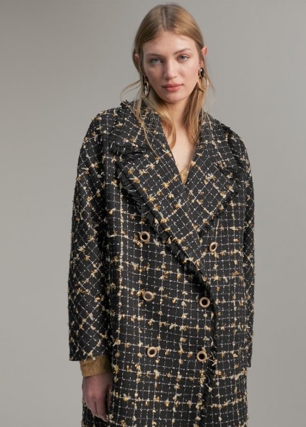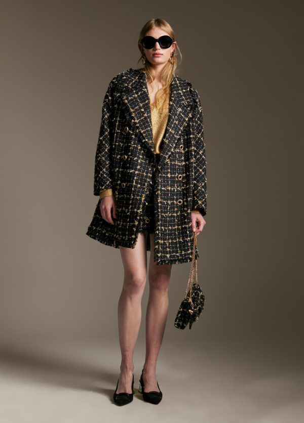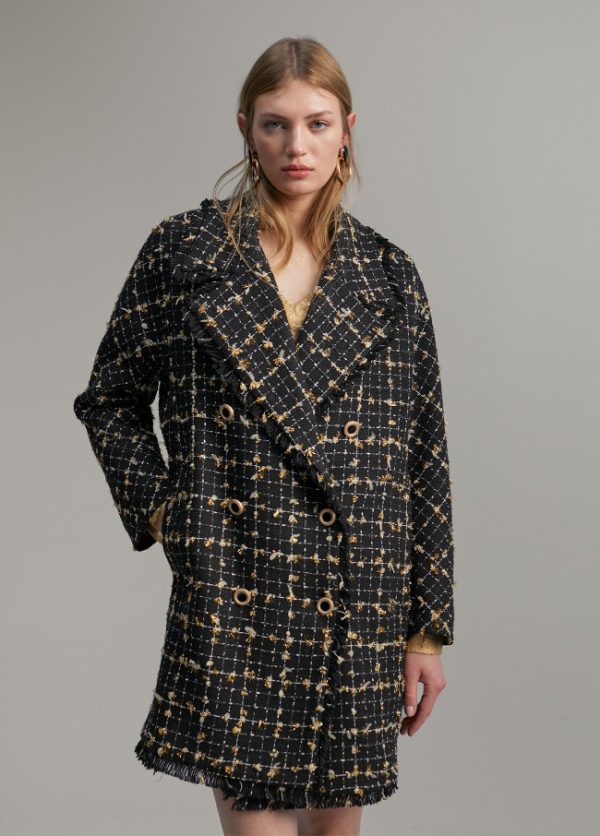 Abrigo corto cruzado de cuadros. Manga larga y cuello solapa. Combinación de color negro con detalles en dorado y lurex. Cierre frontal con botones bicolor. Deatlle de bolsillos en lateral.