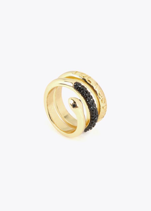 Anillo dorado modelo serpiente con piedras brillantes y logotipo grabado.