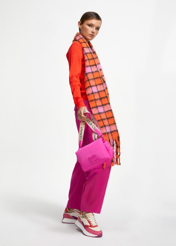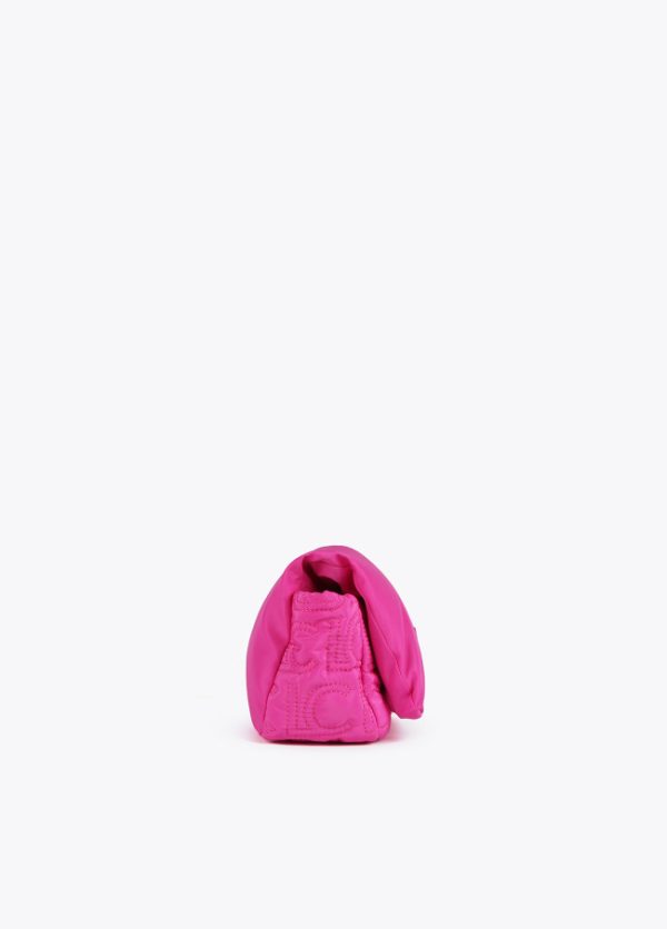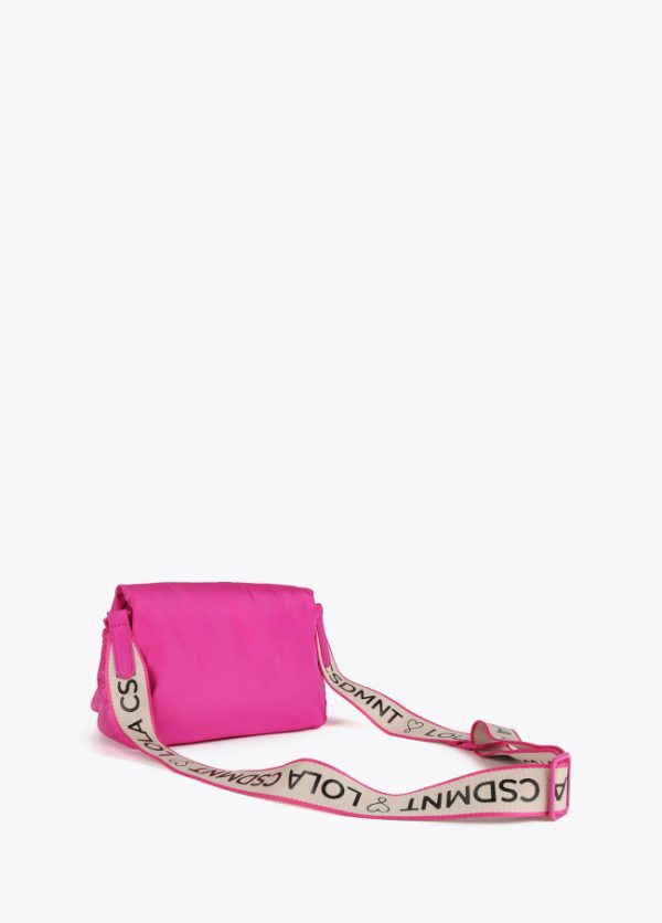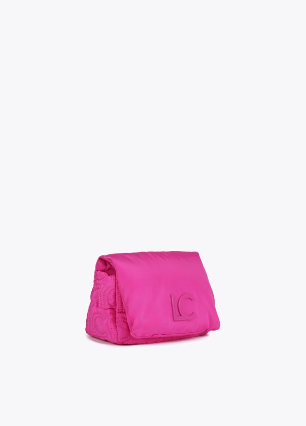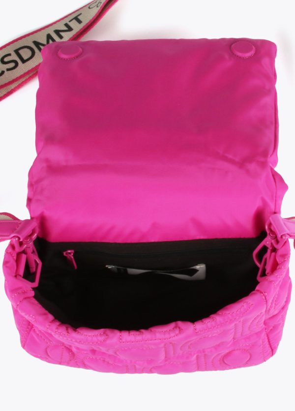 Bolso tipo bandolera acolchada de nylon con monograma bordado. Asa bandolera ajustable y extraíble y cierre en solapa con botones imantados.