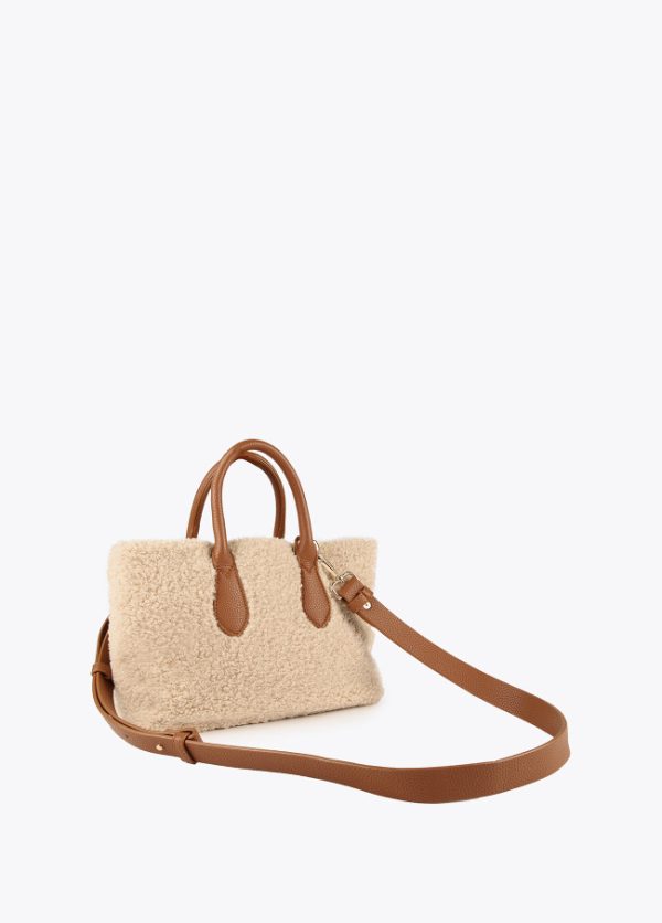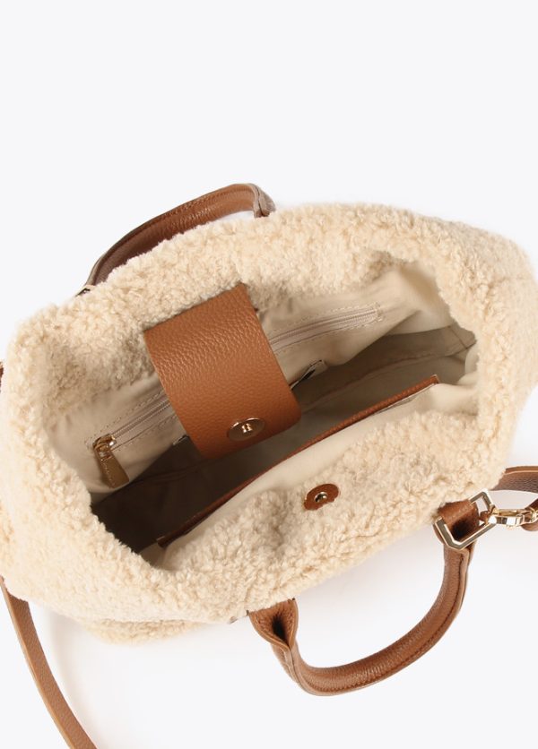 Bolso bandolera de borreguito combinada con detalles en efecto piel. Bolsillo exterior, asas de mano y asa bandolera ajustable y extraíble. Cierre con lengüeta y botón imantado.