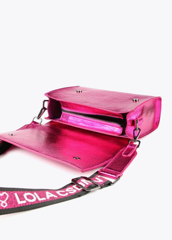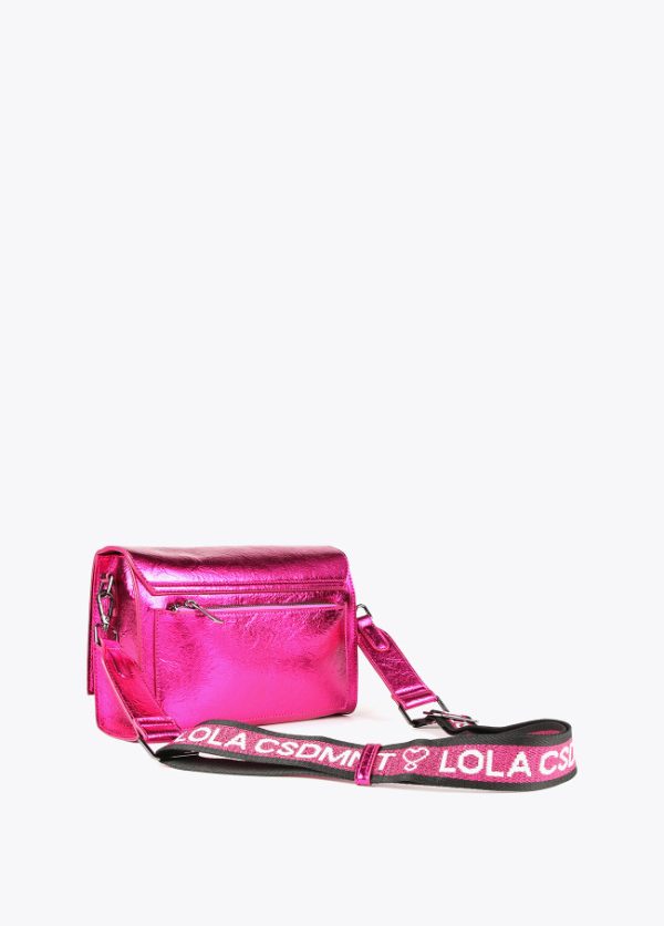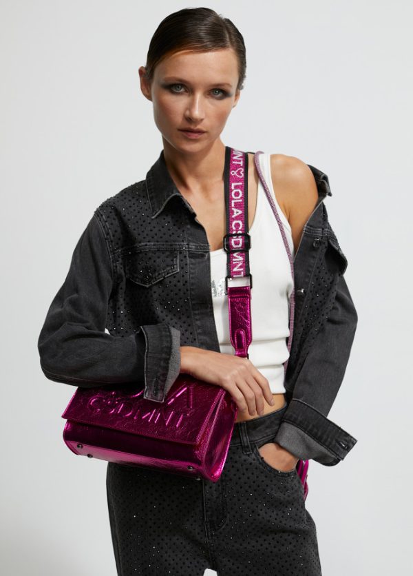 Bolso tipo bandolera en efecto piel metalizada y mega logo en relieve en parte frontal. Bolsillo trasero y central con cierre de cremallera.