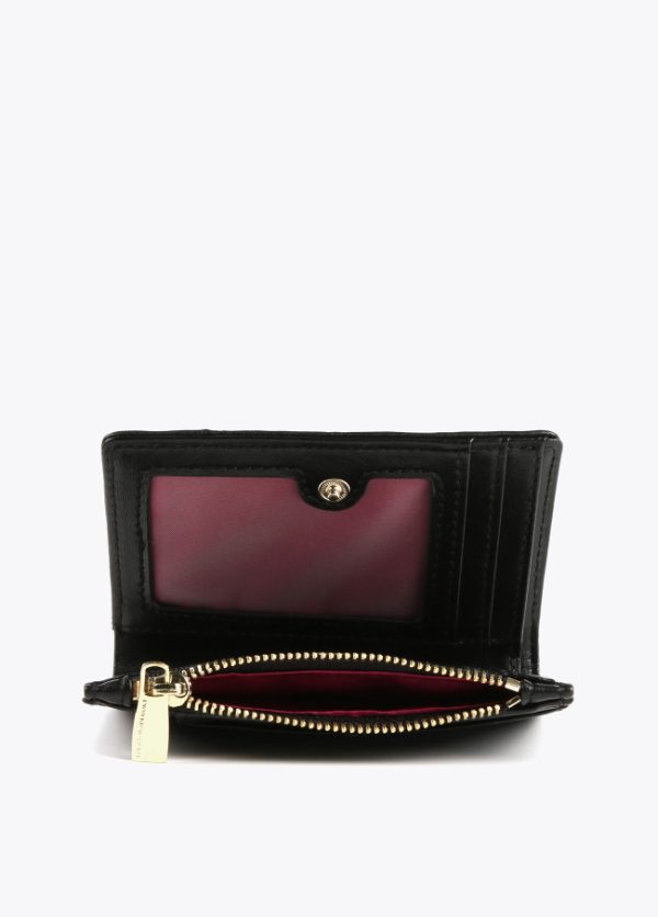 Billetero en efecto piel acolchado con monedero con cierre de cremallera y cierre central con botón clic. Logo dorado con cristales en parte frontal.
