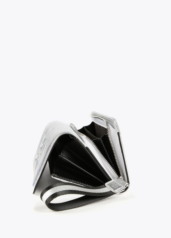 Billetero grande metalizado con logo grabado en parte frontal. Cierre con cremallera y botón clic. Detalle asa de mano.