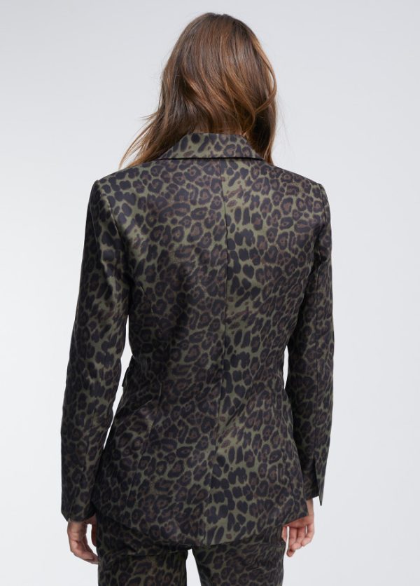 Blazer estampada en animal print. Cuello solapa y cerrada con botones metálicos dorados. Bolsillos tapete y vivo en frontal.