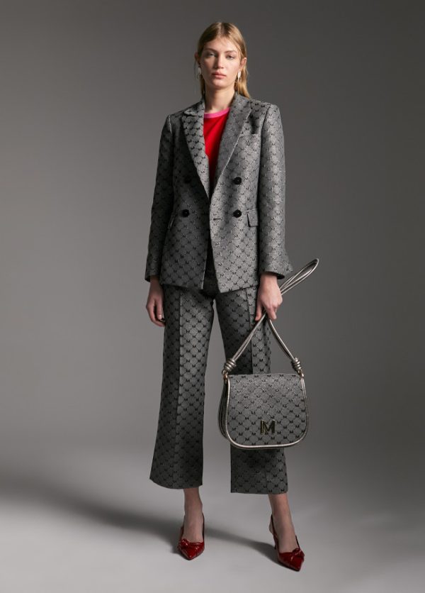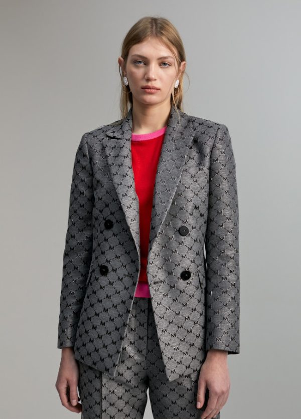 Blazer jacquard en monograma M bicolor en lúrex. Cuello solapa y cruzada con botones. Tapete de bolsillos en laterales.