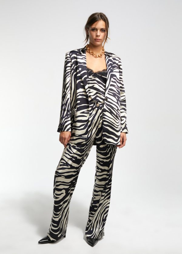 Blazer largo de estampado animal. Cuello solapa y manga larga. Falso bolsillo con tapete en delantero y cierre frontal con botón.