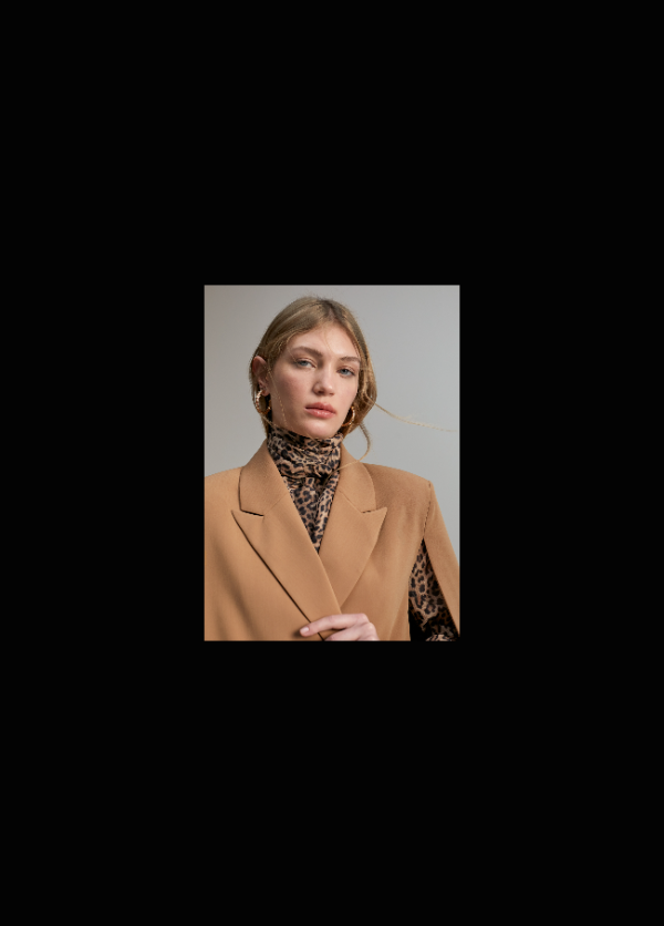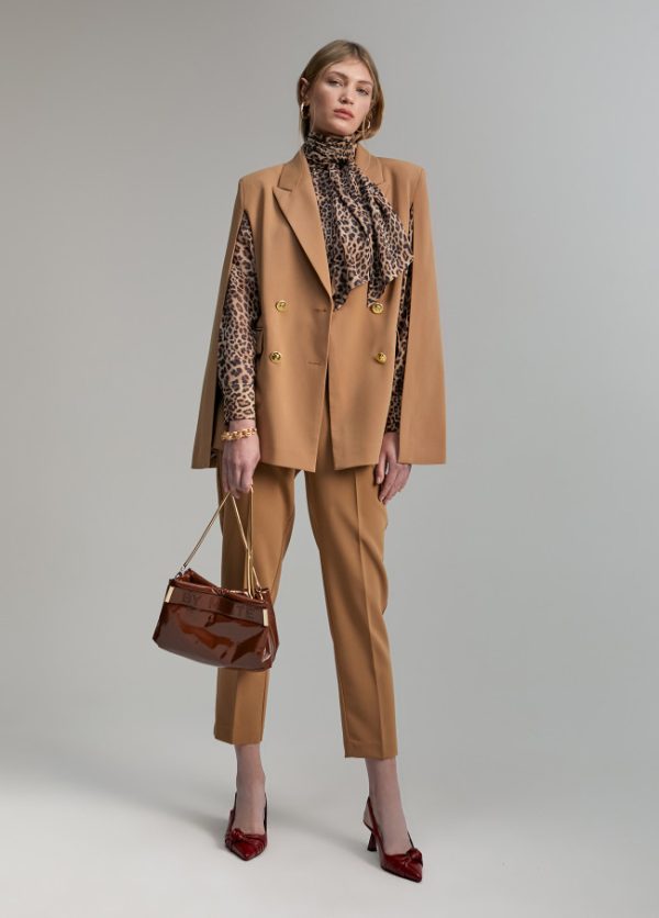 Blazer tipo capa con cuello solapa. Botones frontales en dorado. Tapete de bolsillos laterales. Forro contrastado en estampado animal print.
