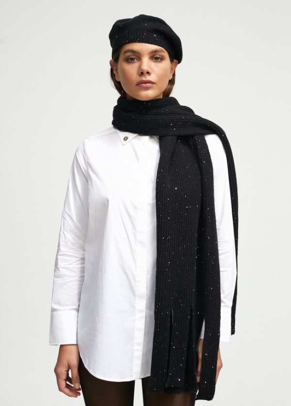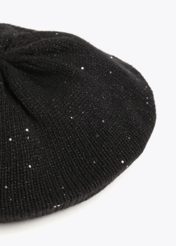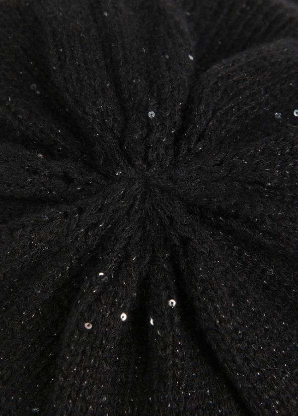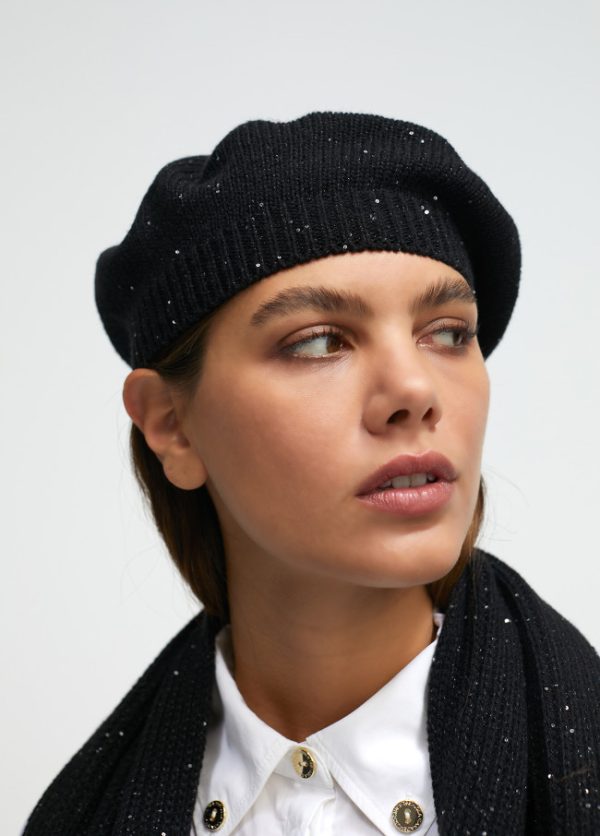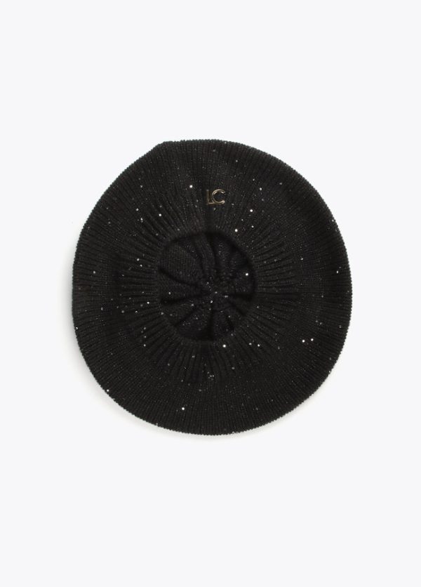 Boina en color negro con micro lentejuelas. Detalle letras logo doradas.