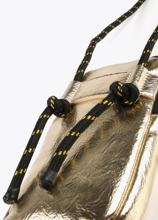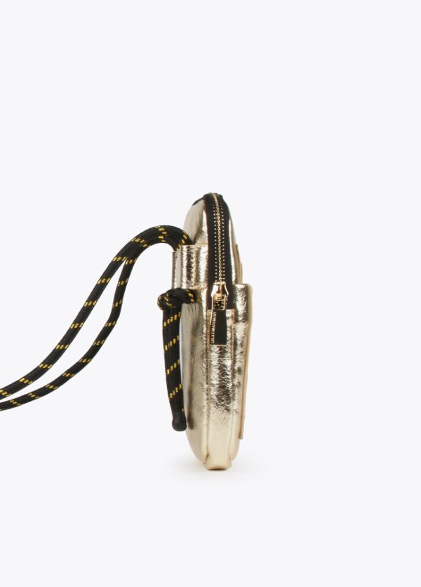 Bolsito porta móvil metalizado con logo grabado en relieve y cierre de cremallera. Asa bandolera de cordón ajustable.