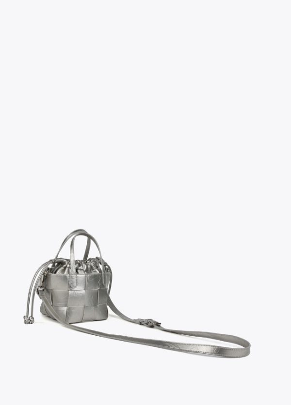 Bolsito trenzado en efecto piel con textura y saquito interior. Contiene asa bandolera y pequeño compartimento interior. Cierre con cordón ajustable.