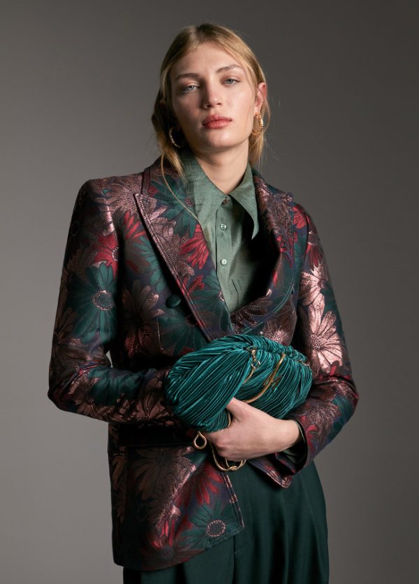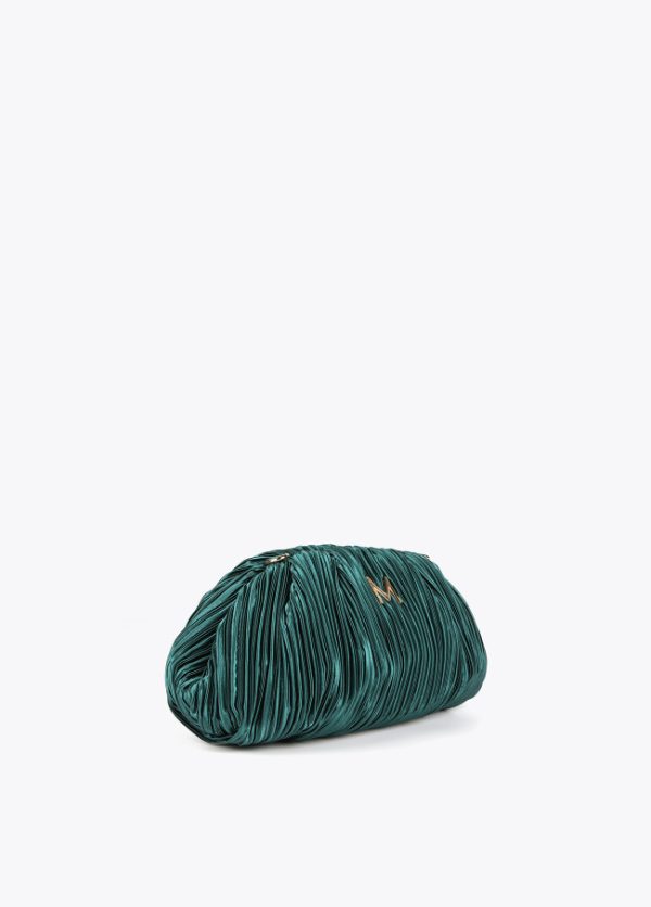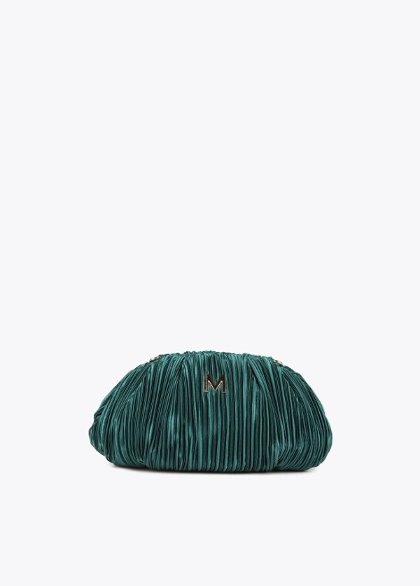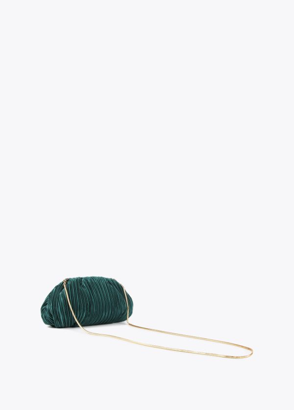 Bolso de fiesta con forma de concha plisado con cadena dorada extraíble. Detalle letra logo dorada en parte frontal.