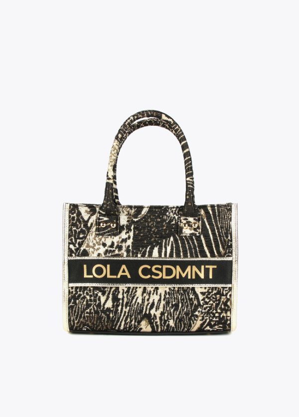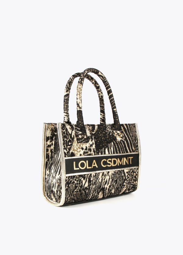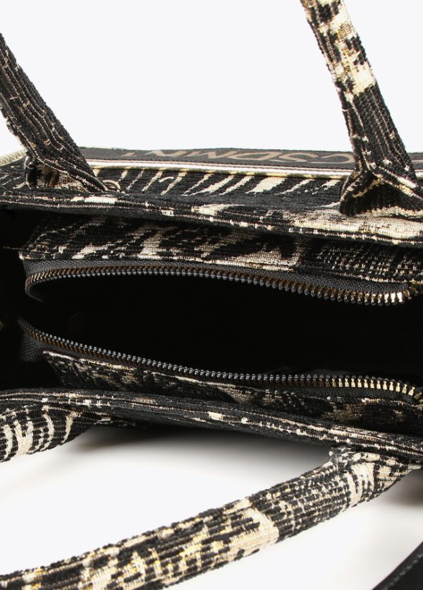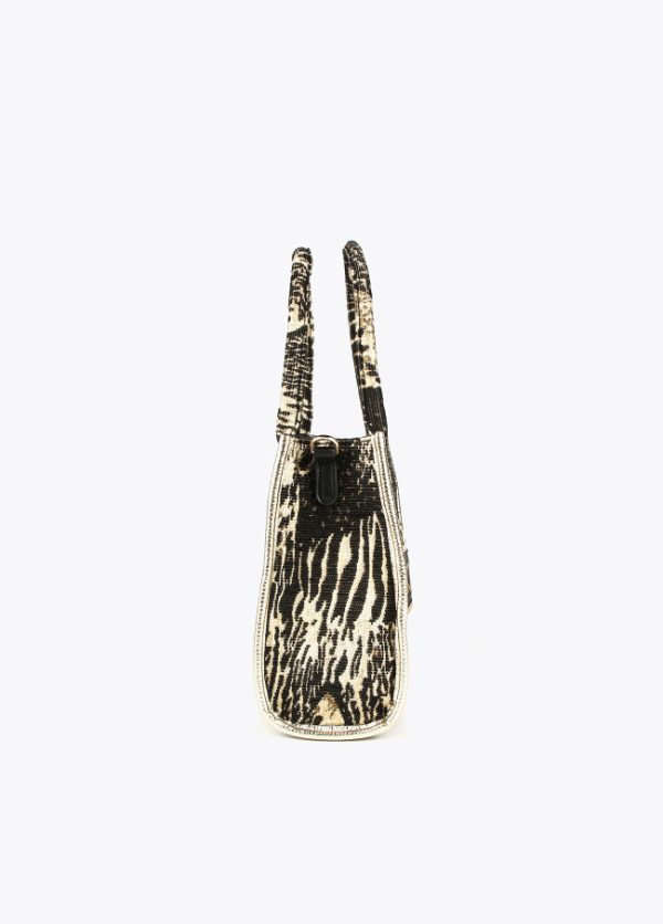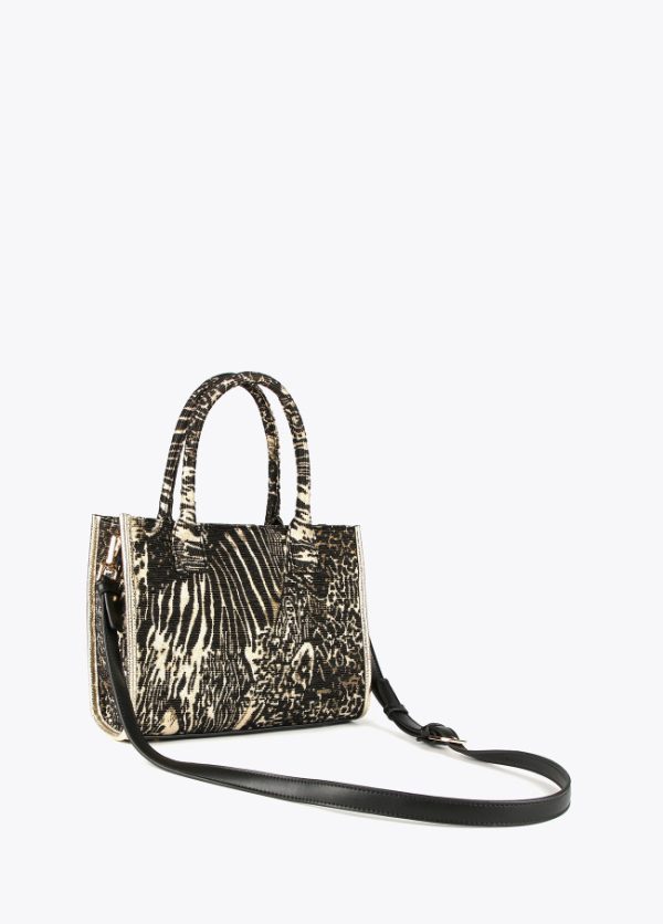 Bolso formato mini shopper en tejido jacquard de estampado animal. Asas de mano y asa ajustable de hombro estilo bandolera. Detalle de logo en delantero y cierre interior con cremallera.