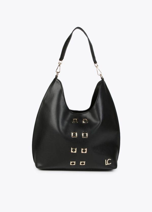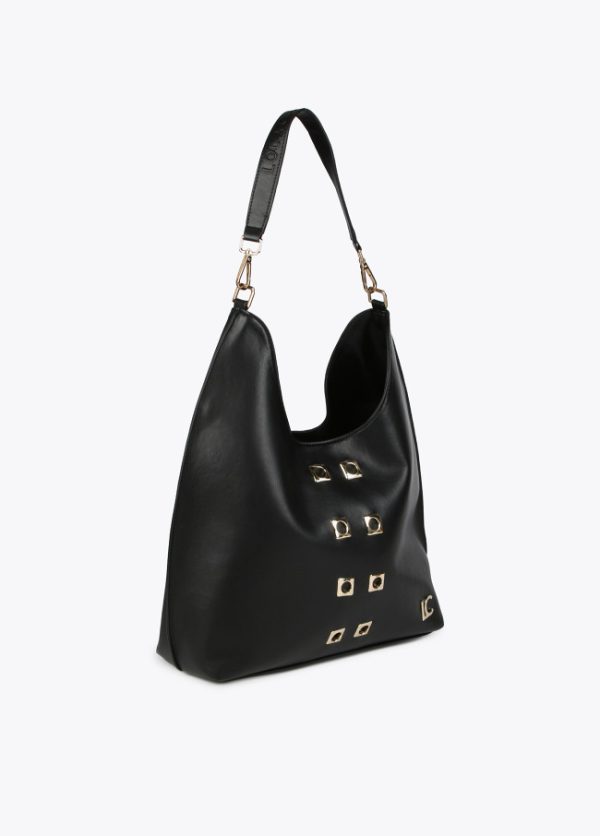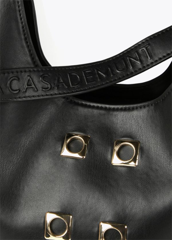 Bolso shopper en efecto piel con ojales metálicos cuadrados. Detalle de bolsillo interior con cremallera. Contiene asa para hombro y cierre de imán.