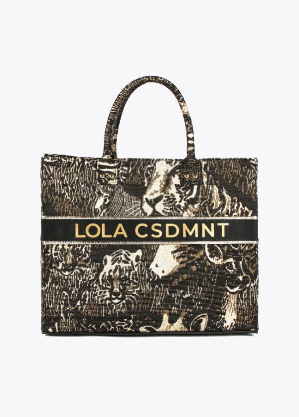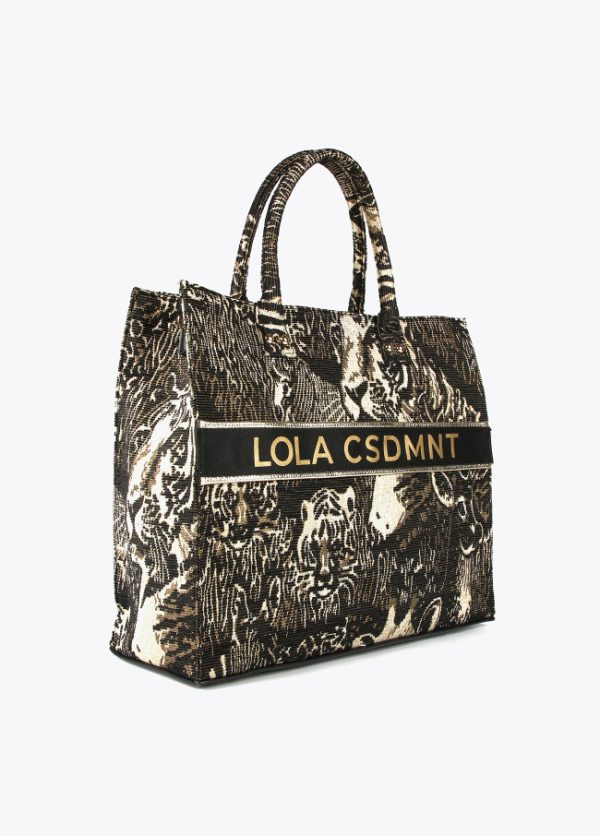 Bolso formato shopper en tejido jacquard de estampado animal. Asas de mano y asa ajustable de hombro estilo bandolera. Detalle de logo en delantero y cierre interior con cremallera.