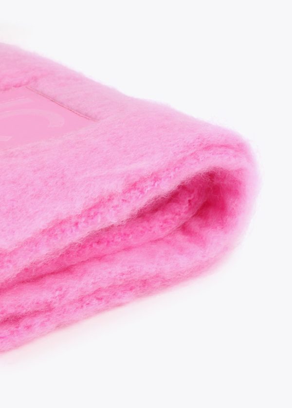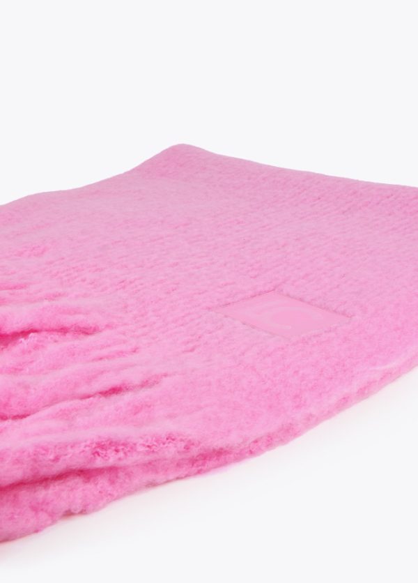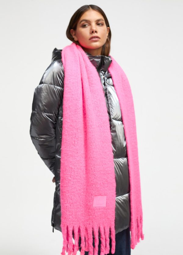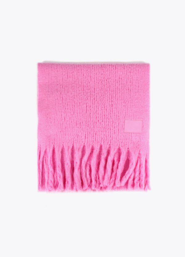 Bufanda unicolor con flecos en extremos y logo grabado sobre efecto piel.