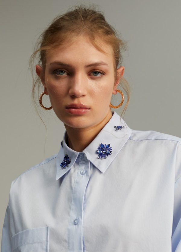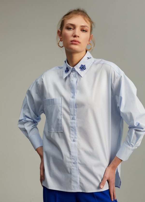 Camisa recta de cuello y puños camisero. Detalle joya en cuello. Bolsillo plastrón en frontal. Cerrada con botones.