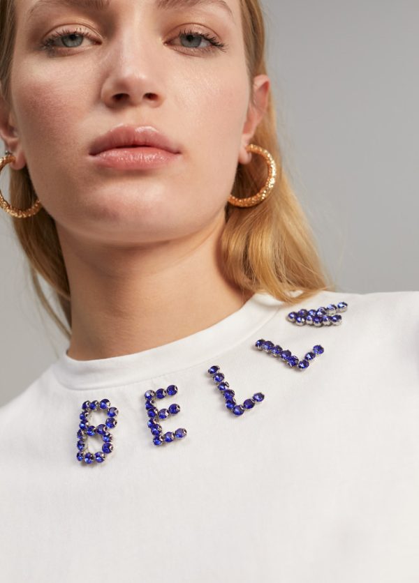 Camiseta de manga corta y cuello caja. Detalle BELLA en pedrería contrastada.