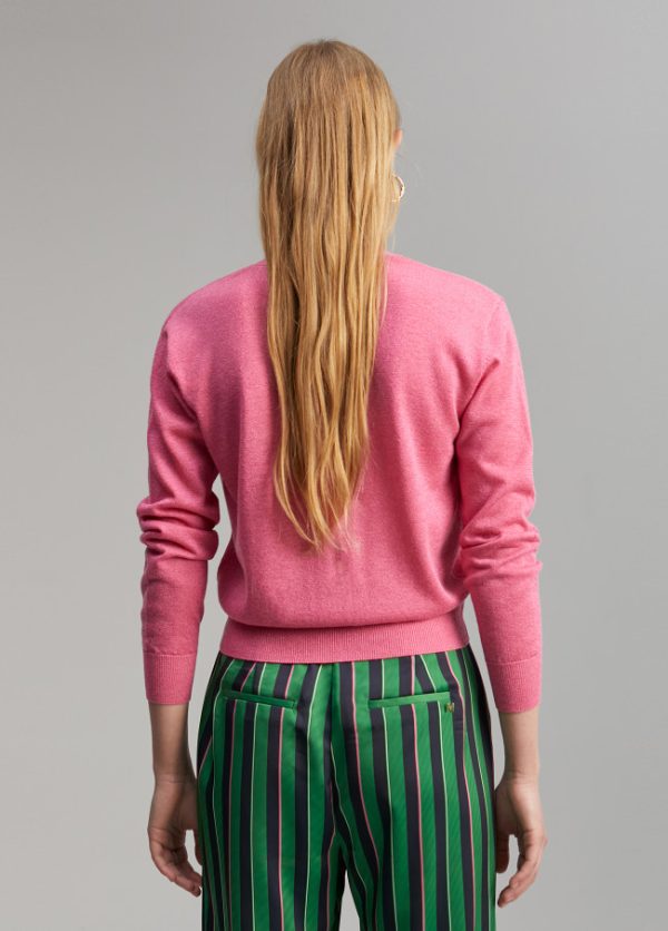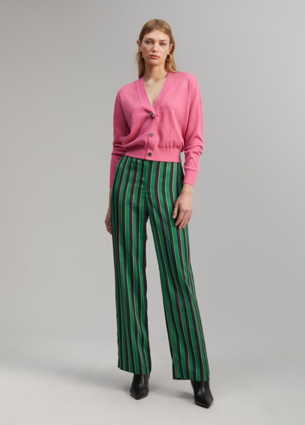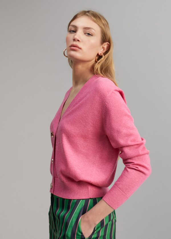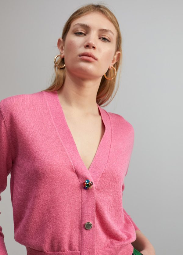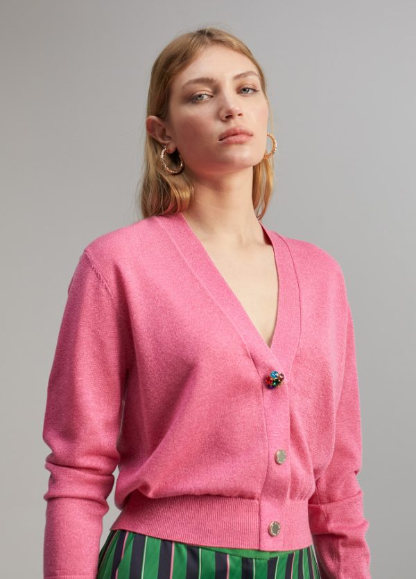 Cárdigan corto de cuello pico. Detalle de botón joya.