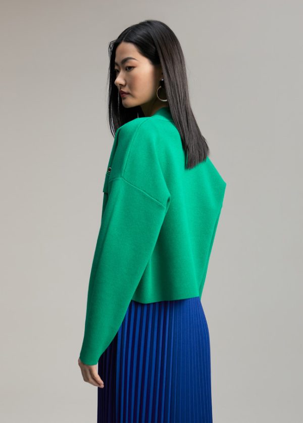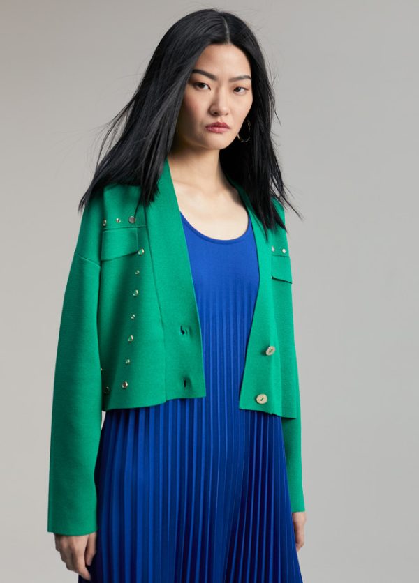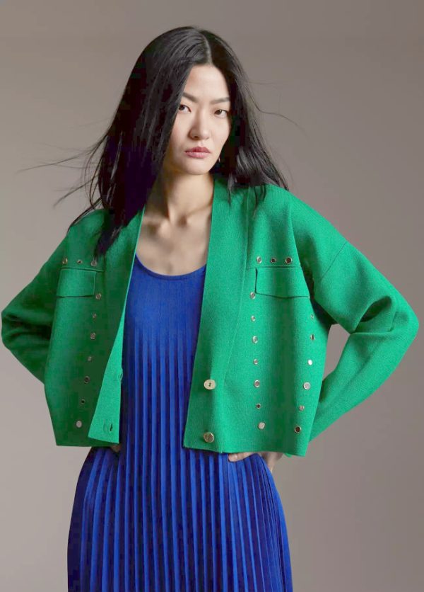 Cárdigan corto. Tapetes frontales y cerrado con dos botones metálicos. Detalle de mini espejos metálicos.