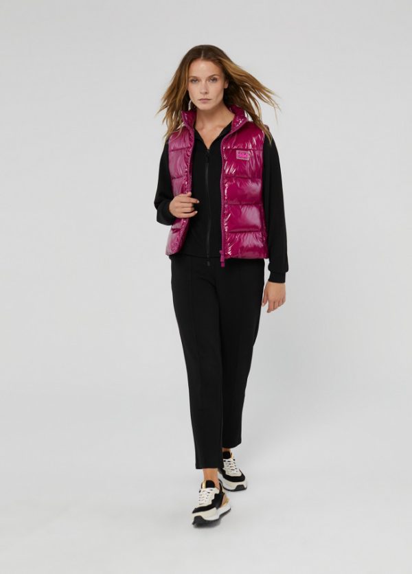 Chaleco corto acolchado en efecto charol. Cierre con cremallera de doble carro a tono. Bolsillos laterales y logo serigrafiado en bajo espalda.