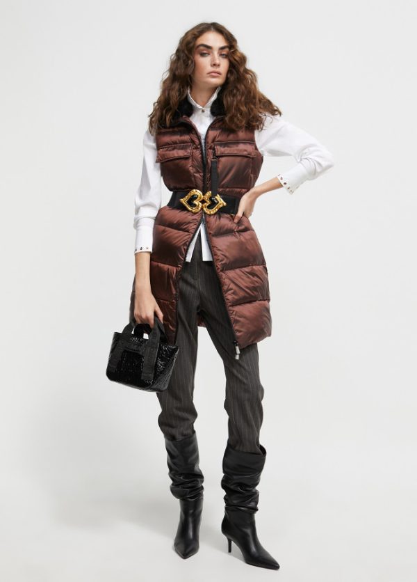 Chaleco acolchado efecto metalizado. Cuello de pelo. Bolsillos superiores tipo plastrón con tapete. Bolsillos laterales cerrados con cremallera. Cintura ajustable. Cierre con cremallera de doble carro.
