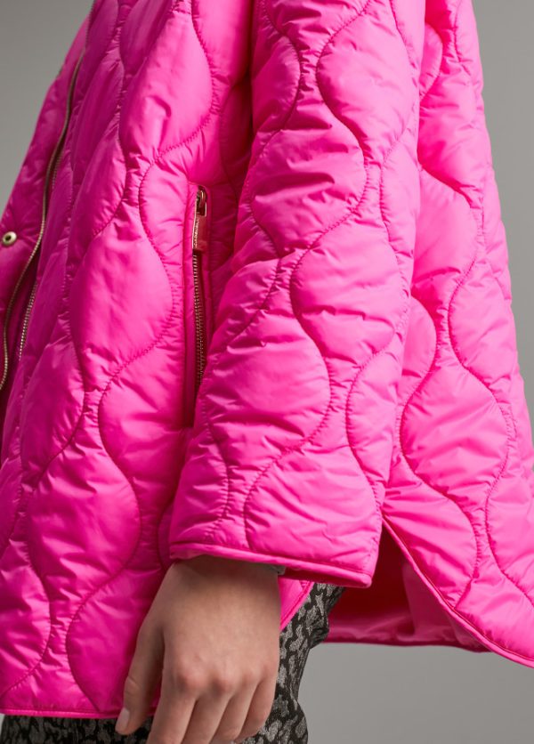 Chaqueta acolchada de cuello caja. Cierre con snaps metálicos y cremallera metálica con doble carro. Bolsillos laterales cerrados con cremallera. Aberturas en bajo lateral.