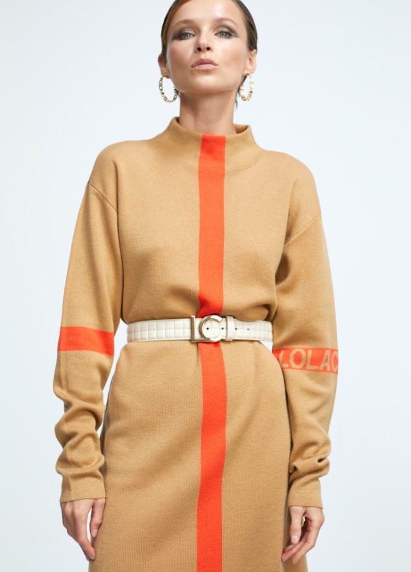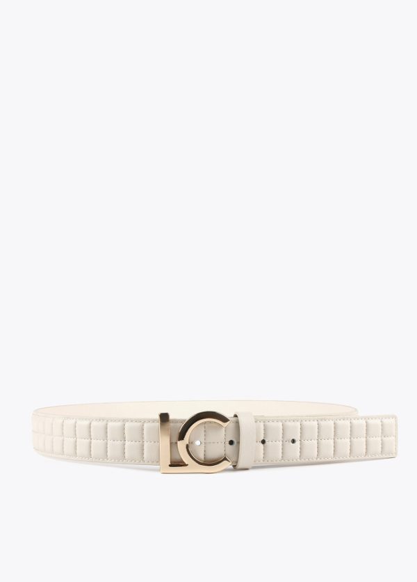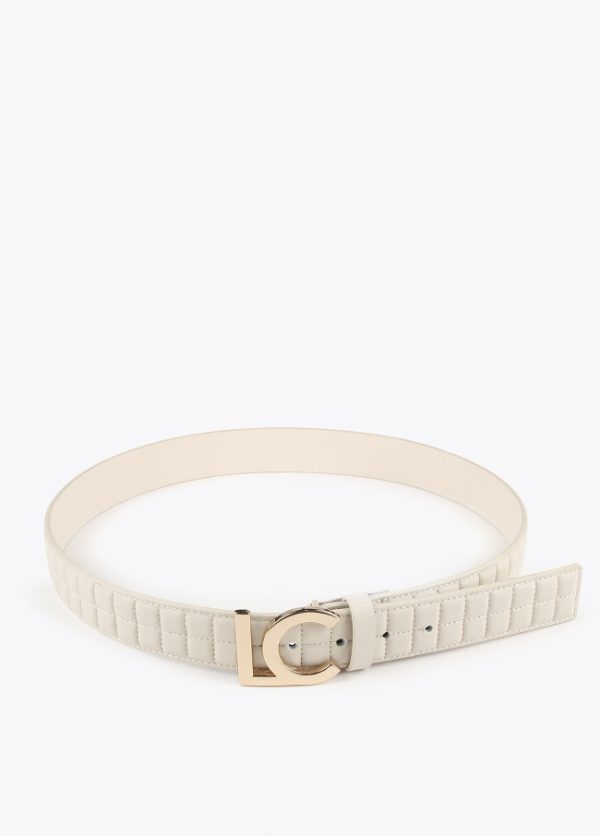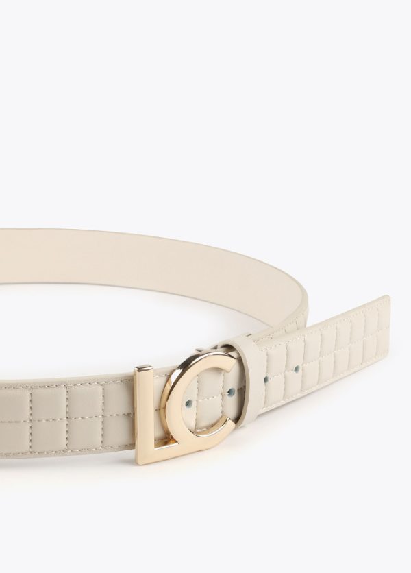 Cinturón efecto piel estilo acolchado con letras logo doradas a modo de hebilla.