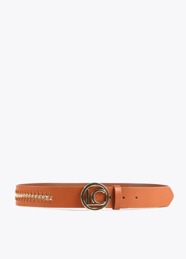 Cinturón en efecto piel con cadena dorada en zona central y letras logo a modo de hebilla.