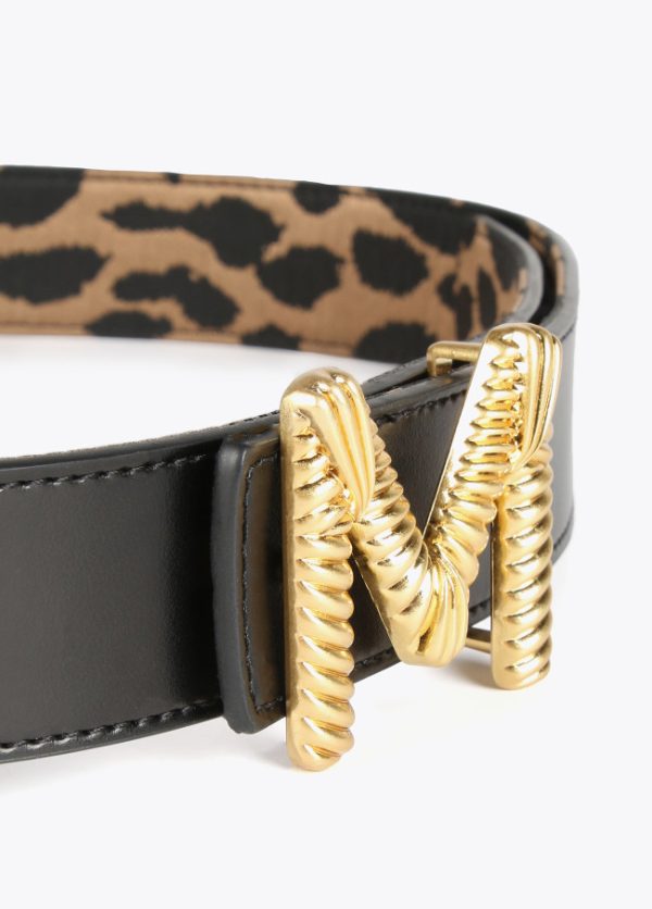 Cinturón reversible en estampado animal con interior contrastado en negro. Hebilla dorada metalizada en forma de logo.
