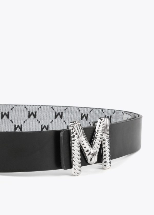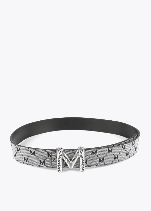 Cinturón reversible en jacquard gris estampado monograma y negro. Letra logo plateada y grabada a modo de hebilla.