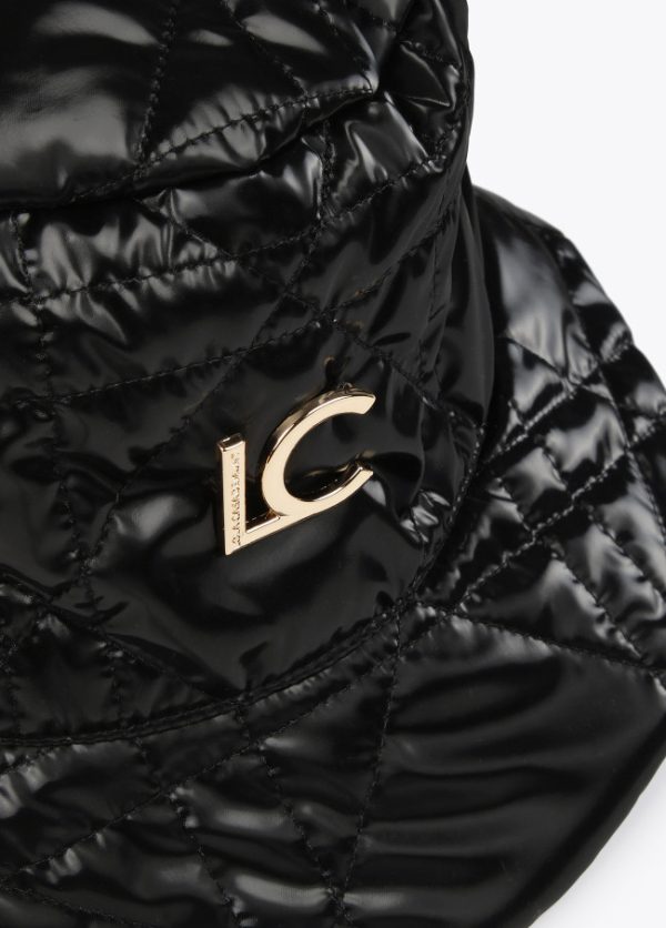 Gorro tipo bucket acolchado en nylon brillante y logo dorado en parte frontal.