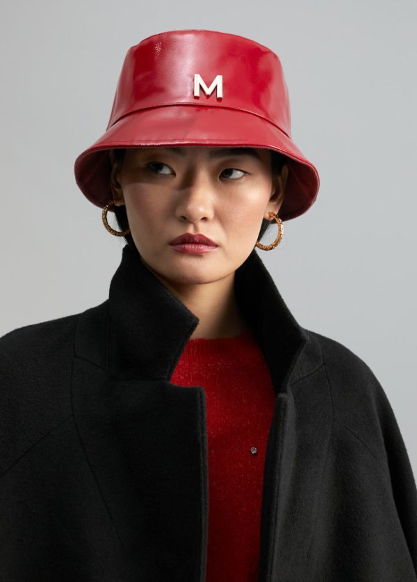 Gorro tipo bucket en efecto charol con letra logo dorada en parte frontal.