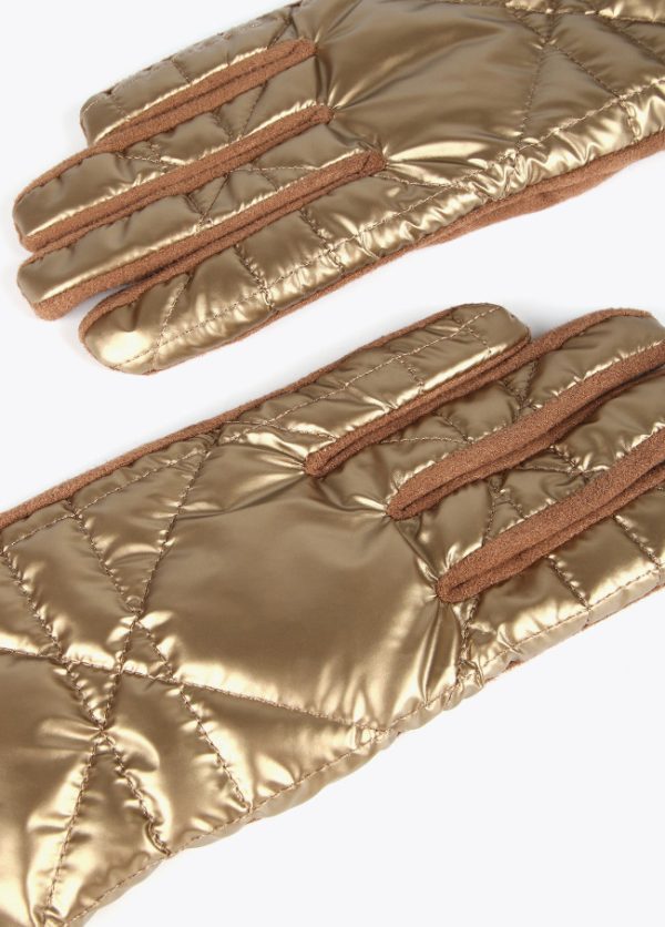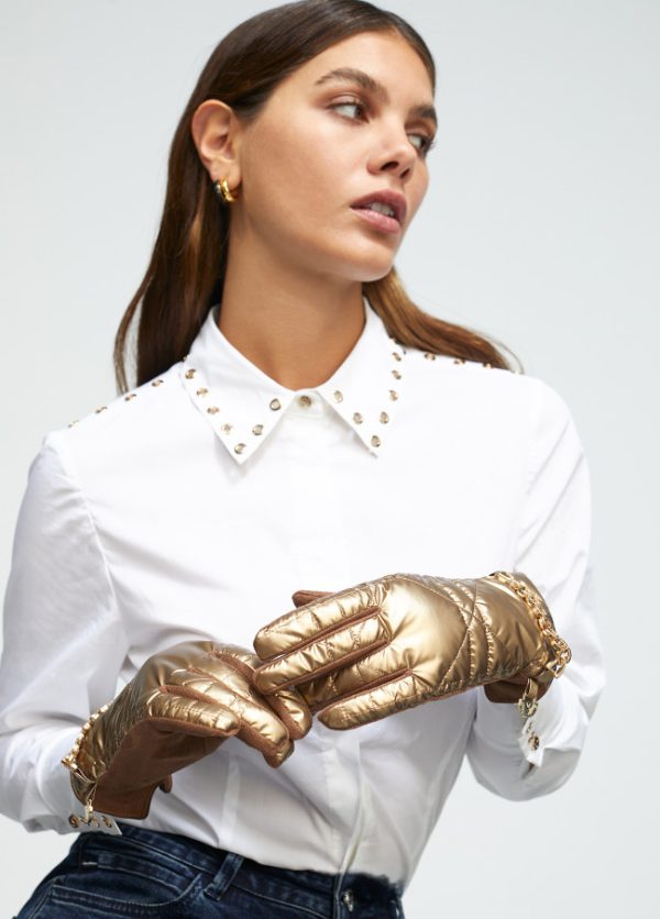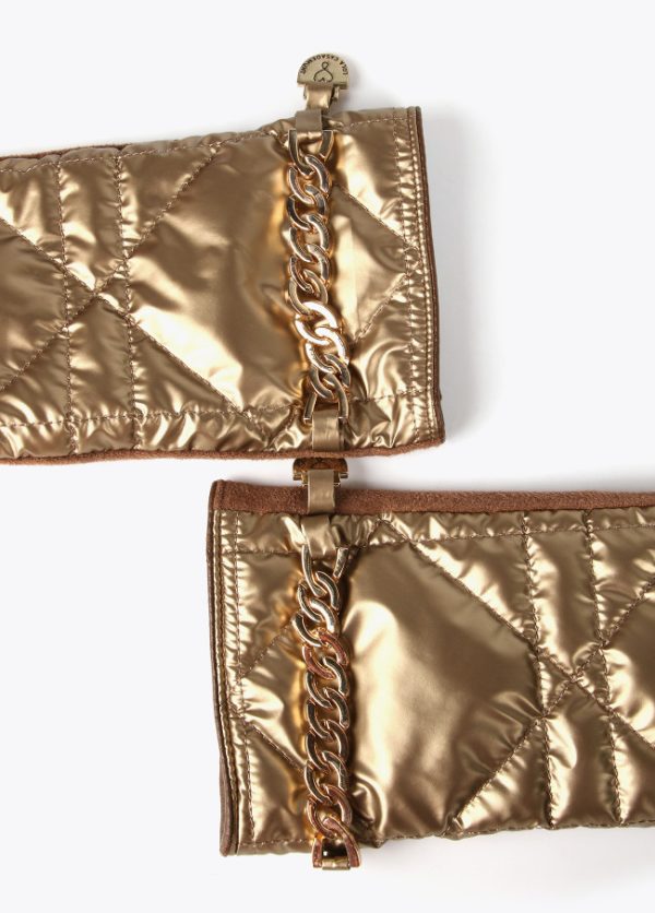 Guantes de nylon acolchados con cadena dorada en zona puños. Detalle medallita logotipada.