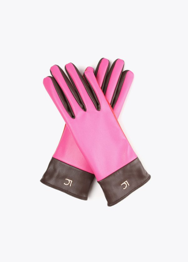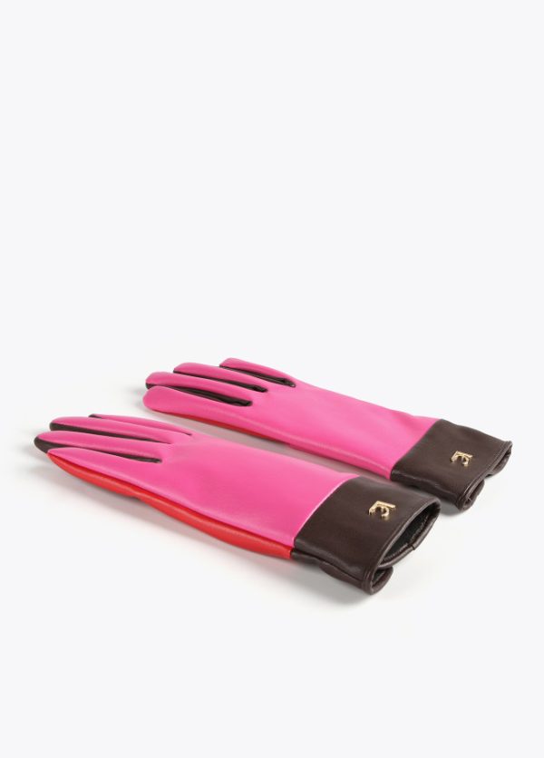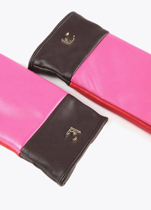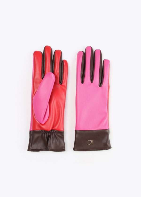 Guantes en efecto piel en tres colore combinados. Letra logo doradas en parte frontal.