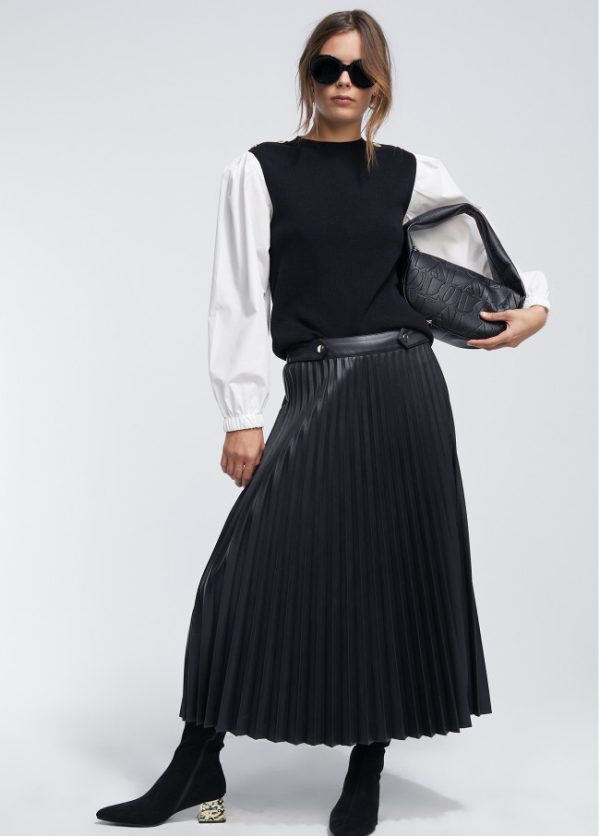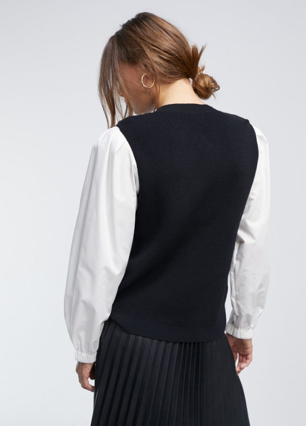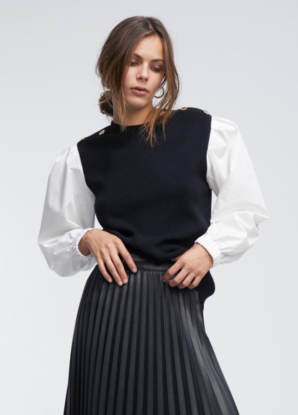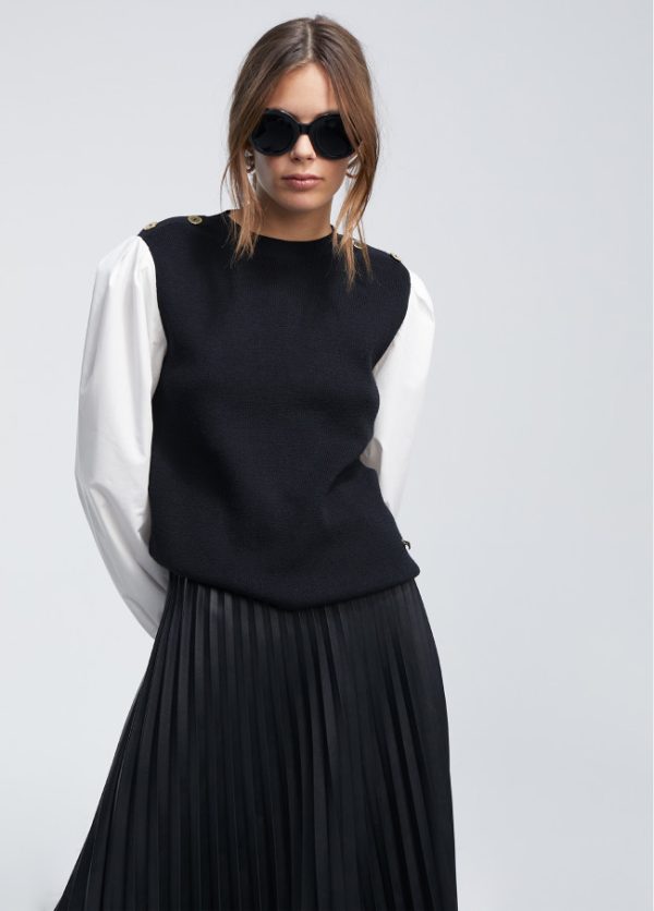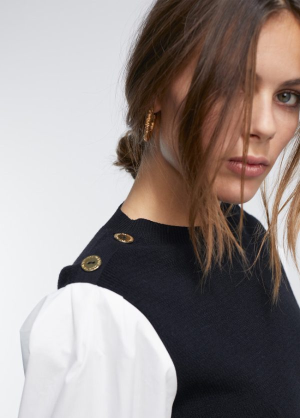 Jersey de punto cuello caja y detalle botones dorados en hombro. Manga camisera de algodón con puño elástico.
