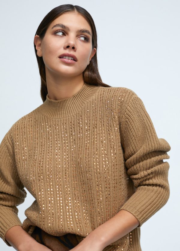 Jersey de punto, cuello perkins. Detalle en frontal con strass a tono.