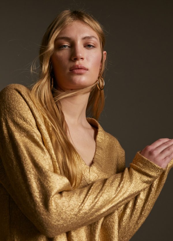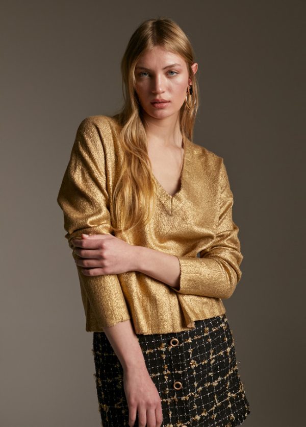 Jersey dorado de punto laminado y cuello pico. Manga larga y detalle de acabados en cintura y puño.