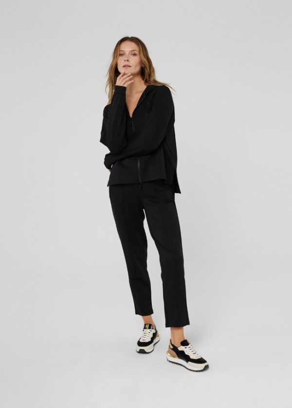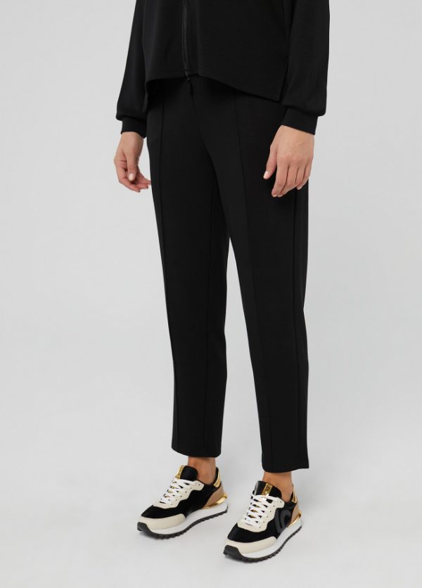 Pantalón jogger recto con bolsillos laterales en color negro y vivo al tono en el front.