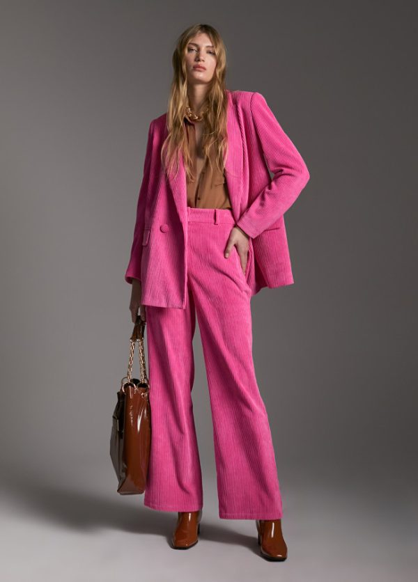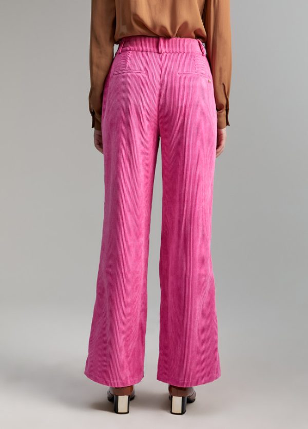 Pantalón wideleg rosa en efecto pana. Pernera ancha y tiro medio. Cintura con trabillas y cierre con cremallera frontal. Bolsillos laterales y falso bolsillo de vivo en espalda.