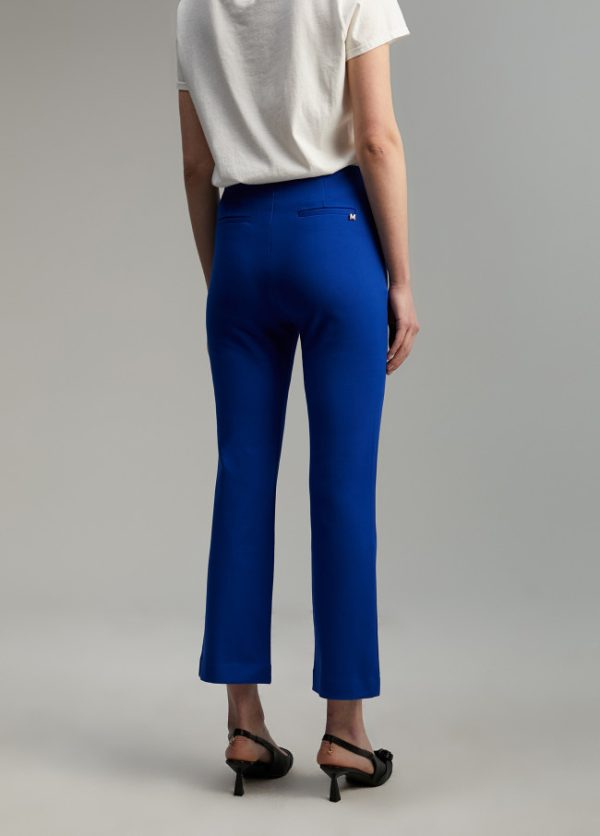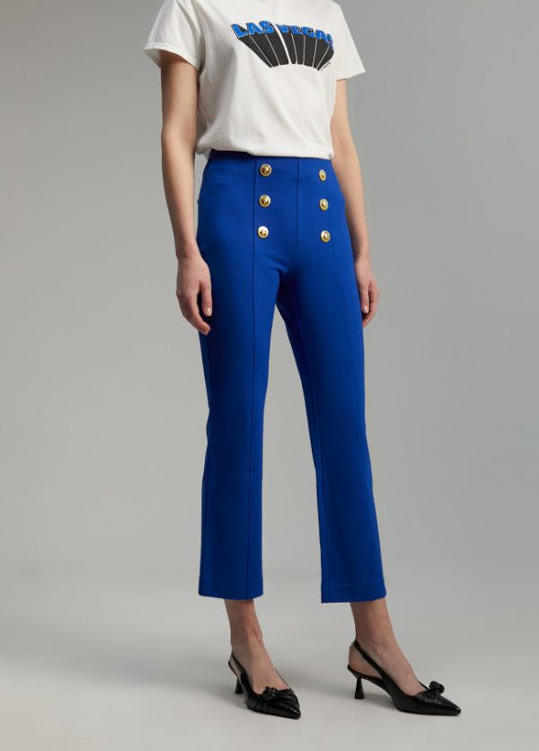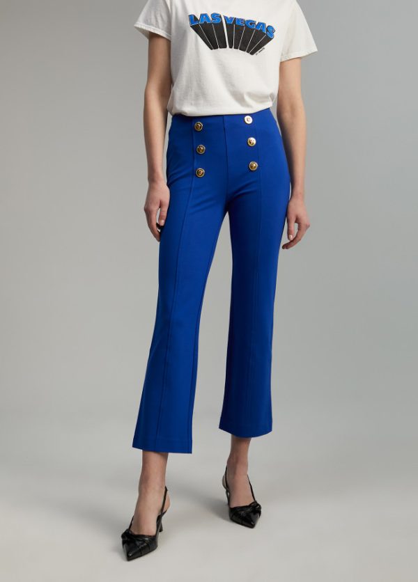 Pantalón de largo tobillero y ligeramente acampanado en bajo. Detalle de botones metálicos dorados en frontal. Cremallera lateral y falso bolsillos de vivo en espalda.