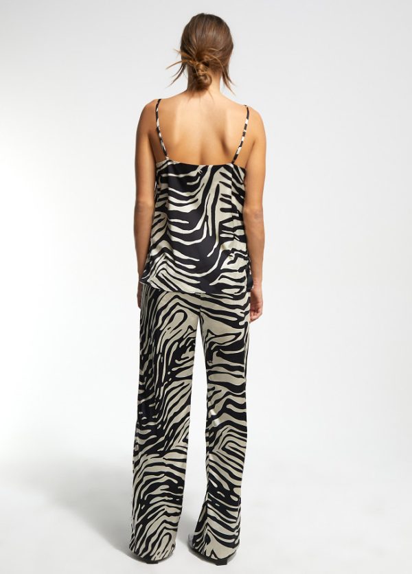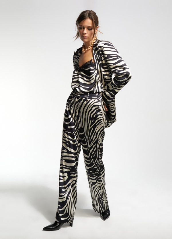 Pantalón palazzo fluido de estampado animal y cintura media. Bolsillos laterales y cierre frontal con botón.
