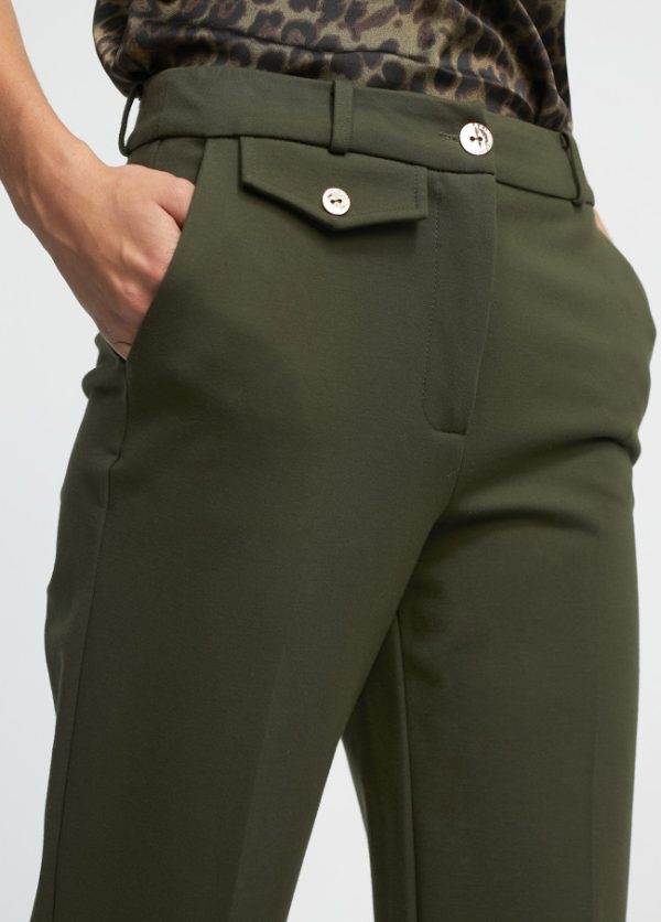 Pantalón recto en punto roma. Detalle tapete frontal con botón. Bolsillos laterales y bolsillo tipo vivo en parte trasera.