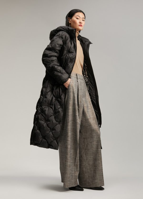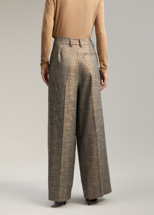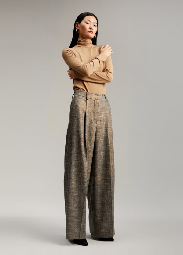 Pantalón wideleg de pernera ancha. Tiro medio y pinza frontal con trabillas en cintura. Cierre con cremallera en frontal. Bolsillos laterales y falso bolsilllo de vivo en espalda.