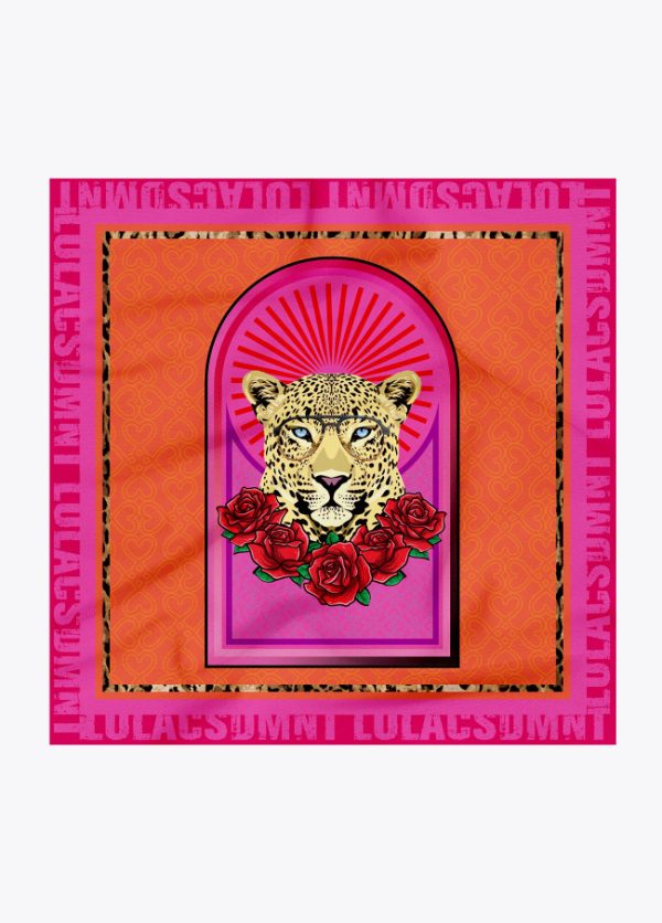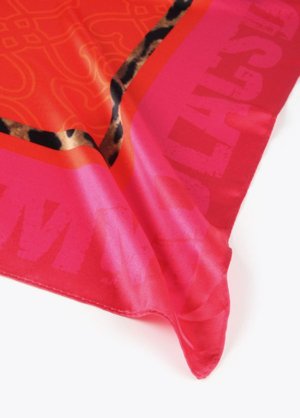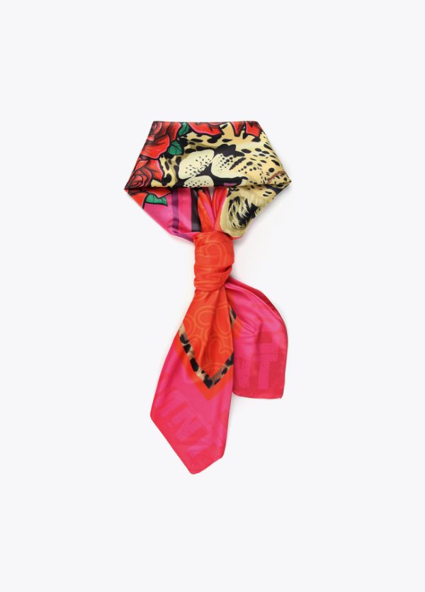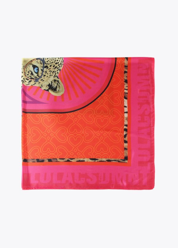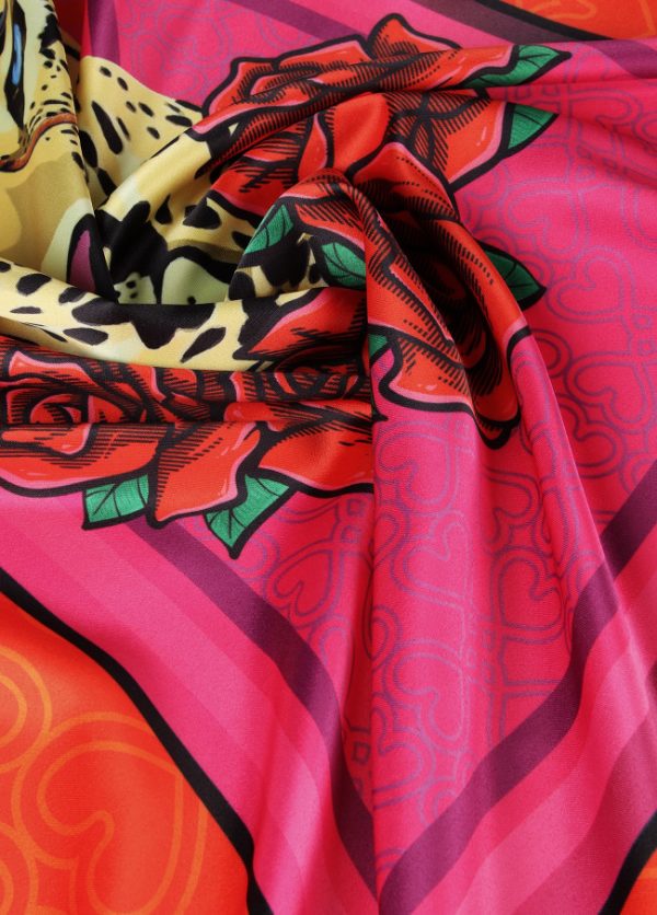 Pañuelo satinado y logotipado con estampado leopardo y flores en parte central.