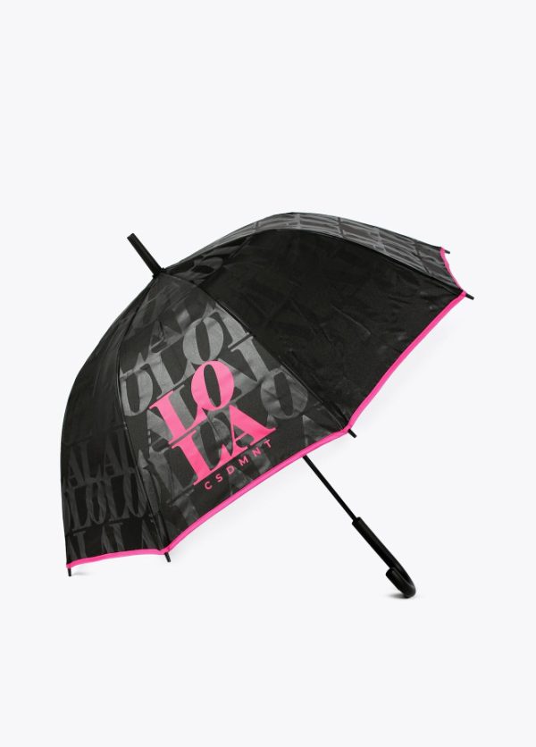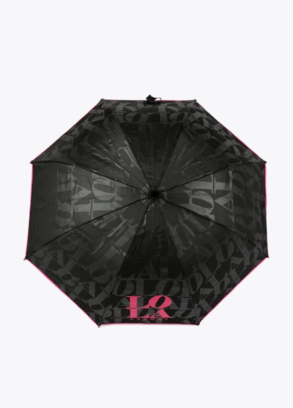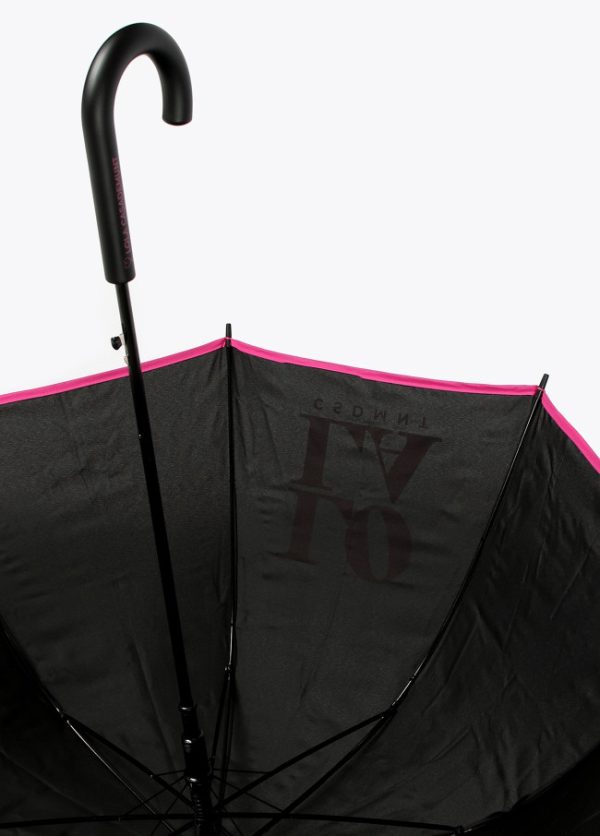 Paraguas grande con estampado logotipado en color fucsia sobre fondo negro. Apertura automática y varillaje de aluminio. Mango de mano logotipado.