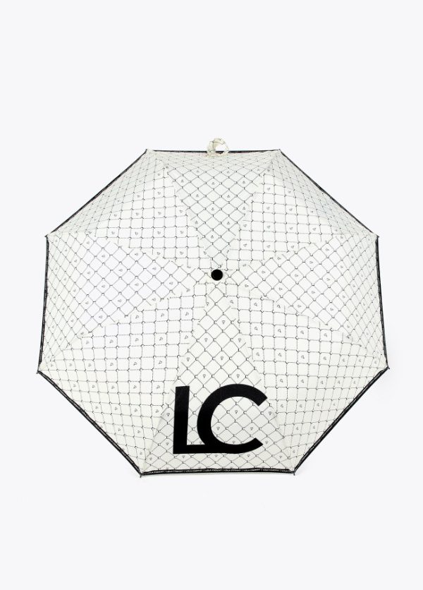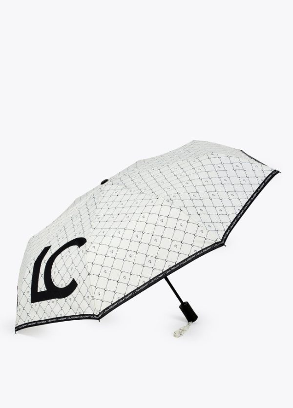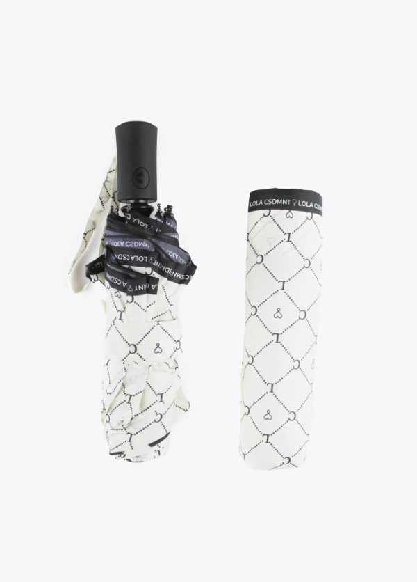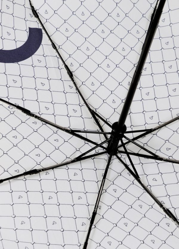 Paraguas con estampado logotipado en color negro sobre fondo blanco. Apertura automática en 3 secciones y varillaje de aluminio. Funda protectora con el mismo estampado y asa de mano.