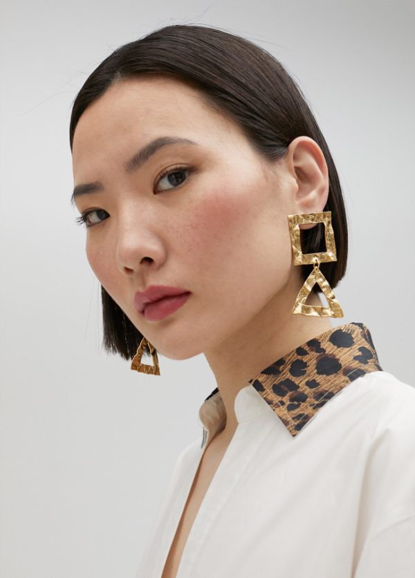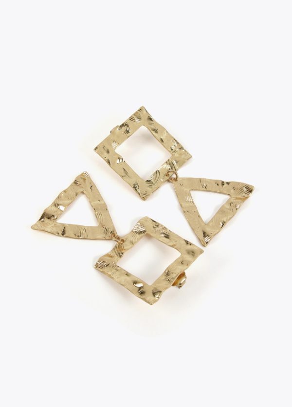 Pendientes de dos piezas geométricas en color dorado con textura grabada e irregular.