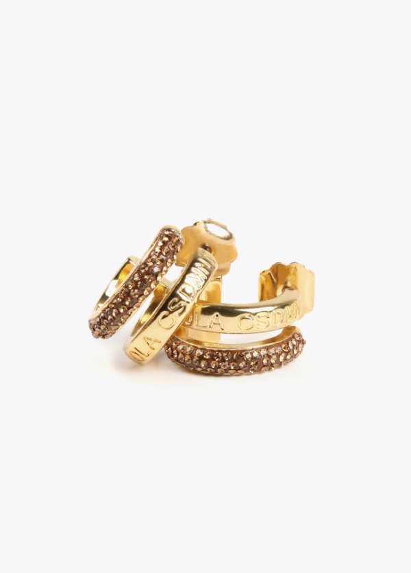 Pendientes dorados de aro doble logotipado y con piedras de color combinados.