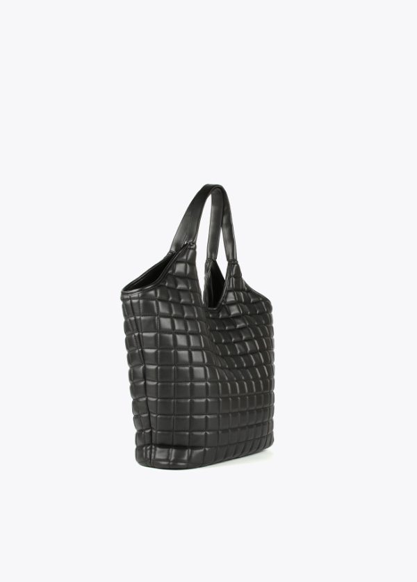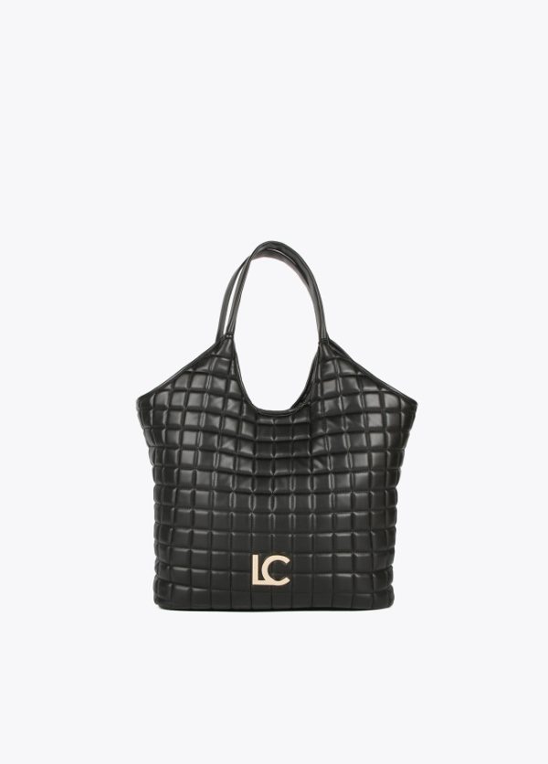Bolso tipo shopper acolchado de cuadros con mega logo dorado en parte frontal. Cierre con botón imantado en lengüeta y detalle bolsito interior.