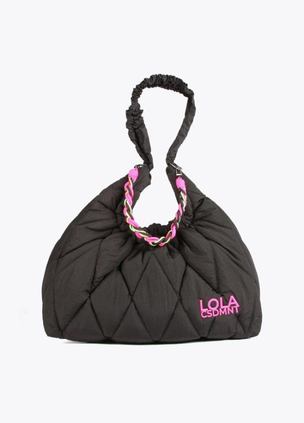 Bolso tipo shopper acolchado con asa trenzada de cordones extraíble. Cierre con botón imantado y logo dorado en parte frontal.